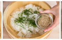 4. Add shiso leaves and roasted white sesame seeds in the bowl of steamed rice. Using a rice scooper, fluff up the rice while you mix in shiso leaves and sesame seeds.