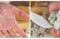 5. Prepare a small bowl of water and a plate of kosher salt, roughly 2 to 3 tsp. Wet your palms with water, dip your fingers into the salt and rub some of the salt lightly onto your palms. Then using a rice scooper, scoop 1/6 portion of the steamed rice (you should be able to make 6 rice balls).