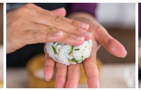 Do not squeeze the rice balls when you are shaping them. Just apply gentle but firm pressure on each stroke as you shape.