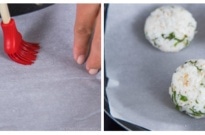 7. Cut the parchment paper to fit the bottom of your frying pan and place it on the pan. Brush the oil on the parchment paper. Place the rice balls and start cooking on medium heat. Make sure to keep some distance between rice balls so they don’t stick to each other.