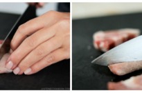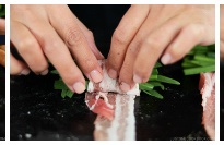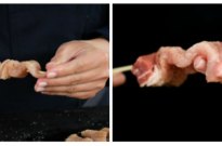 - Equally divide the garlic chives and put them on each end of the four pork belly slices on the cutting board. Roll the garlic chives from one end to the other. Skewer the seam so the pork belly slice will stay in place.
