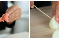 - For sushi ginger, drain it and skewer it as well. For onion, skewer it toward the core.