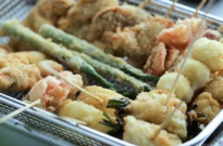 When the oil is hot and ready for deep frying, you want to start with the vegetables or more plain foods first, leaving the meat or strong flavor ingredients for later. That way, the oil stays clean for the plain food without infiltrating the flavors. As you get to the savory food, the oil tends to get darker and flavorful toward the end.
