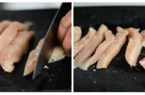 - Cut the pork chop into 4 pieces and pound the meat with the back of the knife to tenderize the meat.