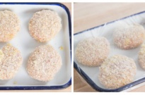 - Prepare 3 separate bowls: flour, beaten eggs, and panko. Dredge and coat each patty in flour, egg, and panko.