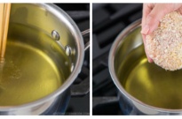 - Drain oil for 1-2 minutes and the remaining heat will cook inside the patty. Pick up the crumbs in the oil as they darken the oil and stick to the new patties.
