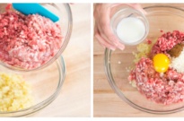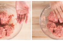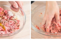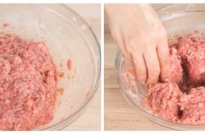 It’s important to knead the meat well with your hands or wooden spatula. The mixture will turn into a pale color and become sticky.