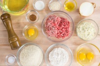 In the large bowl with the onion, add the ground meat, 2 Tbsp panko, 1 Tbsp milk, 1 large egg, ½ tsp nutmeg, ½ tsp Kosher salt, and freshly ground black pepper.