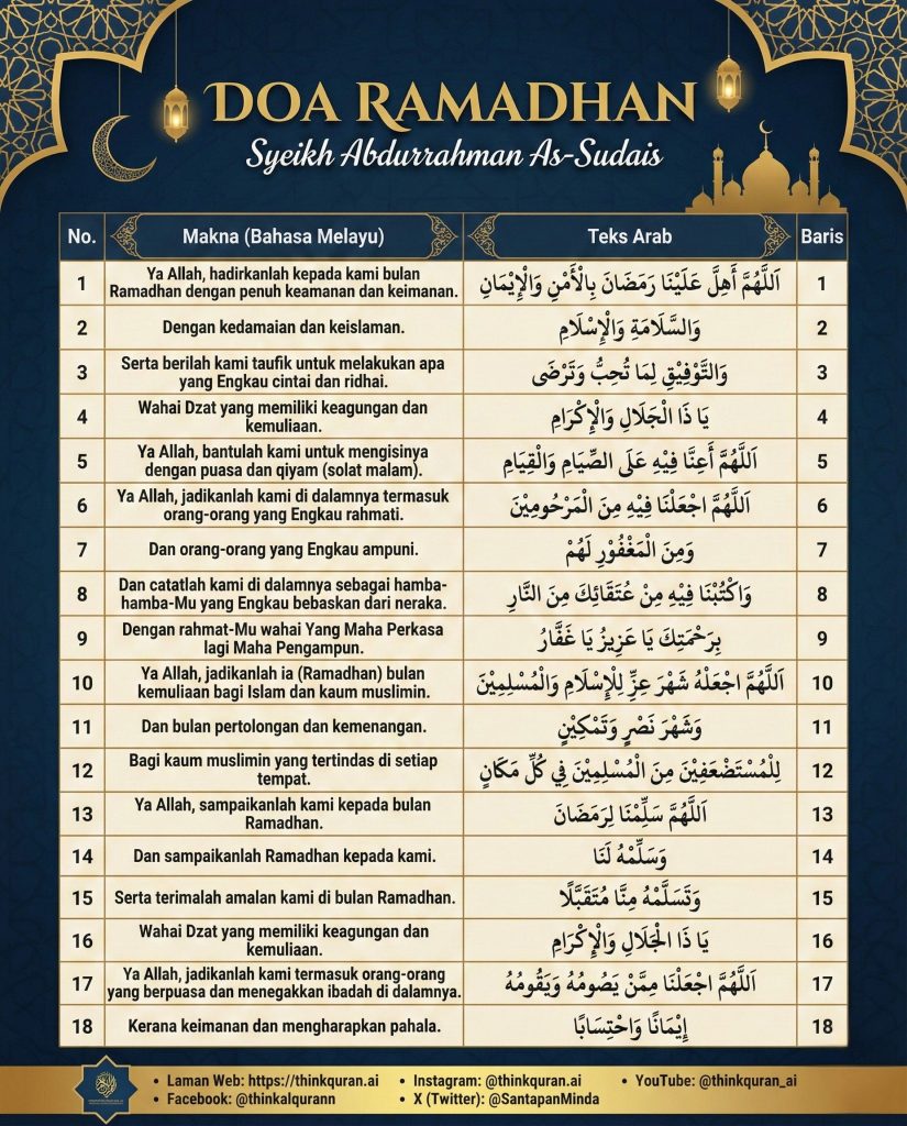 Ramadhan adalah tetamu agung. Cara kita menyambutnya mencerminkan kedudukan tetamu itu di hati kita. Semoga dengan menghayati doa daripada Syeikh Abdurrahman As-Sudais ini, persiapan rohani kita menjadi lebih bermakna dan terarah.